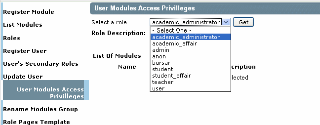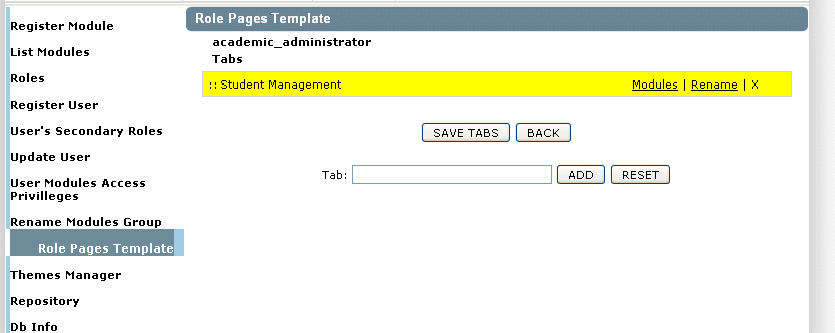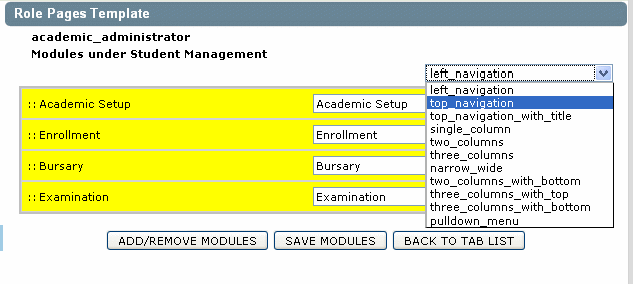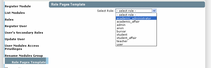 This role is created for users who want to use the Student Management System. After a new role has been created, we need to create portal's view for it. This is called Role Pages Template. To be able to add modules, this role must have privileges to access those modules. Because, we just created this role, there no modules assign to it yet.