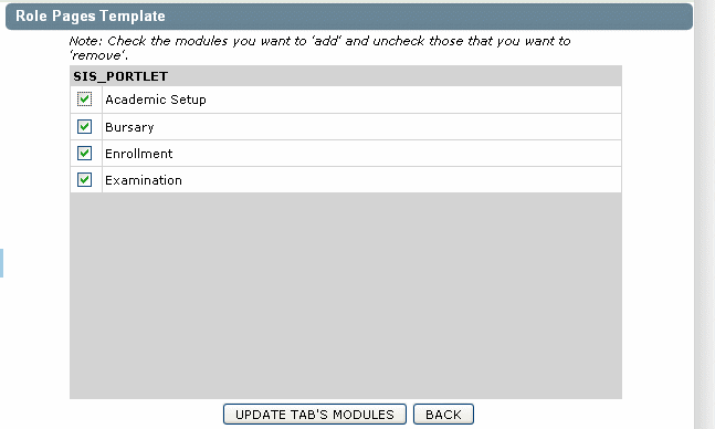 Click on the ADD/REMOVE MODULES button. You shall get a page as shown below. Click all the modules under SIS_PORTLET group, and click the UPDATE TAB'S MODULES button.