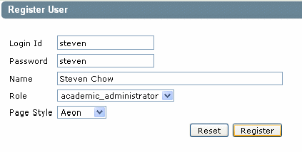 In this example, a user with login id steven, password steven, Name Steven Chow, Role as academic_administrator and Page Style Aeon is created as below: