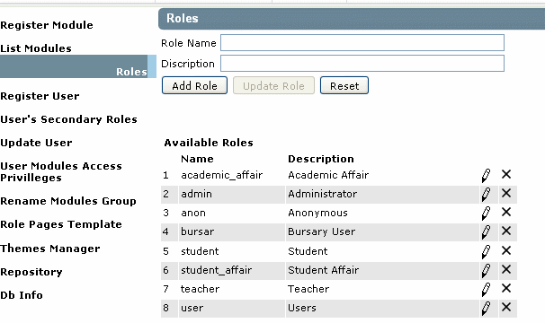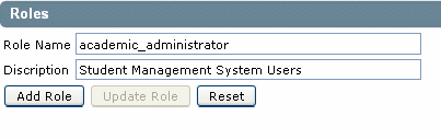 To add a role, just key in the Role Name (required) and the Description of the role (optional). Then click the Add Role button. For example, create a role name academic_administrator.