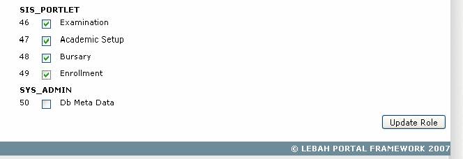 A list of all available modules in the portal are shown as below. Locate the group of modules called SIS_PORTLET, and check all the modules under this group, then click the Update Role button.