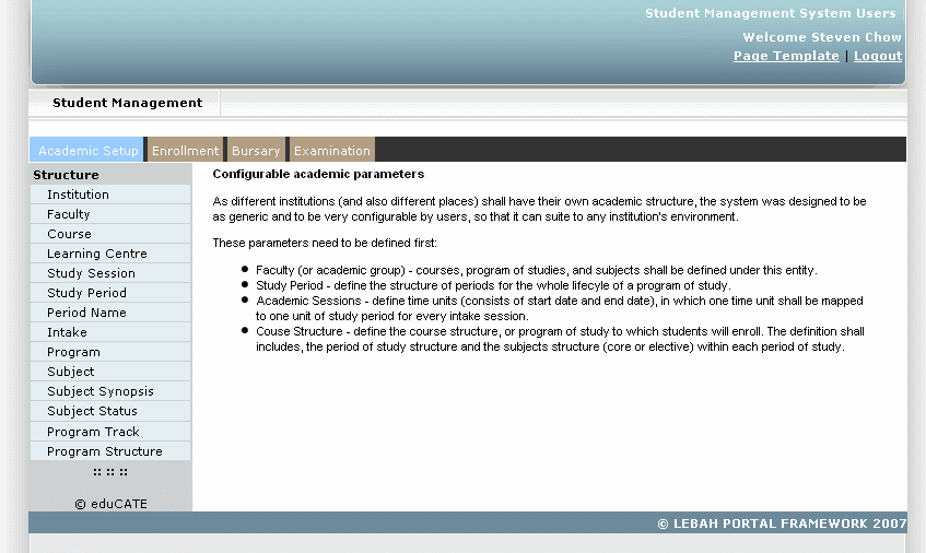Let's test this newly created user with the role academic_administrator. But first, you must log out from current user. And log in again using username steven and password steven.